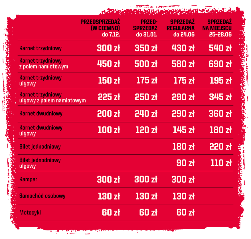 • Bilety wstępu: Nie ma możliwości zakupu miejsc wyłącznie na pole namiotowe. Miejsca dostępne są tylko w pakiecie z karnetami trzydniowymi na festiwal.